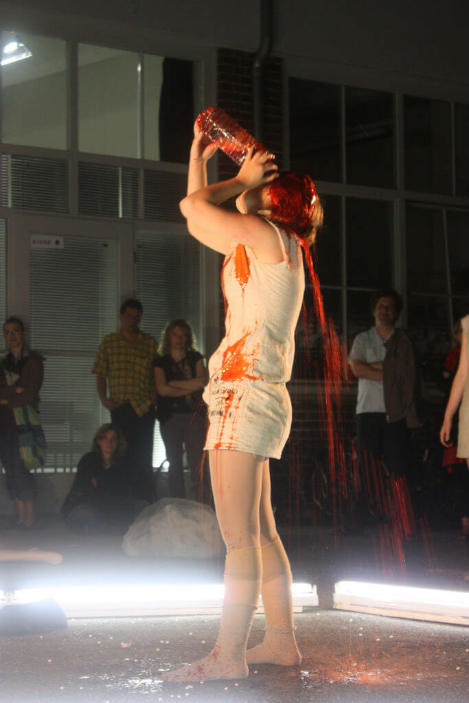 Die Performance ereignet sich in einem fiktiven, durch Licht gekennzeichneten Raum. Die Performer*innen sind Ausstellungsobjekte und Handelnde. Sinnlich und materialintensiv wird der Bühnenraum bespielt, es werden Spuren hinterlassen, die dann wieder ausgestellt werden. „Saft“ integriert dabei Elemente der Produktion Faust Vol.1.